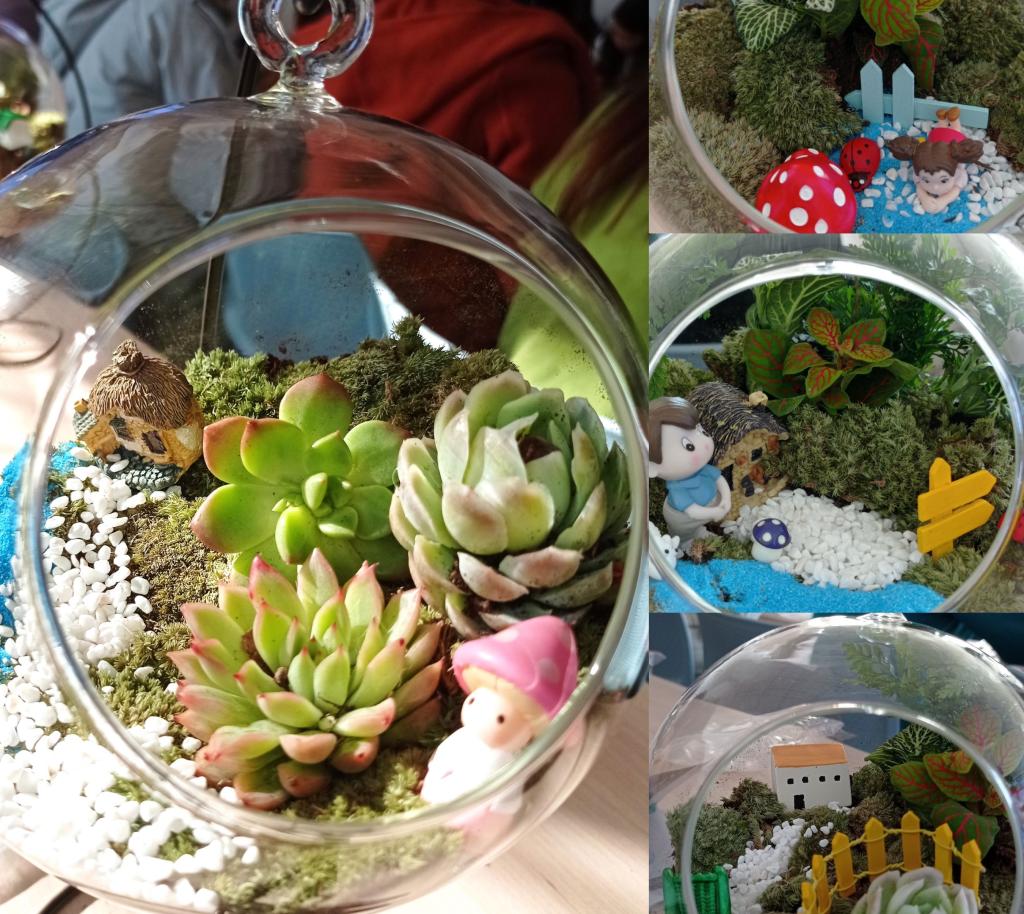 本次三八妇女节活动包括三个环节:一是观看苔藓微景观DIY视频;二是在规定的时间内制作苔藓微景观;三是学习种植养护多肉的小知识。女职工们心灵手巧,将多肉、苔藓、水苔等新鲜植物及小摆件等摆放在敞口吊瓶中,呈现出一幅幅生活气息浓重的小景观。本次活动的纪念品是自己制作的苔藓微景观,有课的女职工也在课后将自己的材料包领回去进行制作。