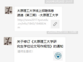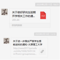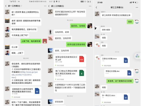 在疫情防控期间,公司和研究生院关于研究生的科研管理工作均做出重要指示,包括延期开学通知、体温日报、网络授课及研究生论文指导等。为更好配合公司工作,作为研究生教育的第一负责人,在收到重要文件通知后,第一时间在微信群中向员工发布,做到信息及时共享。
